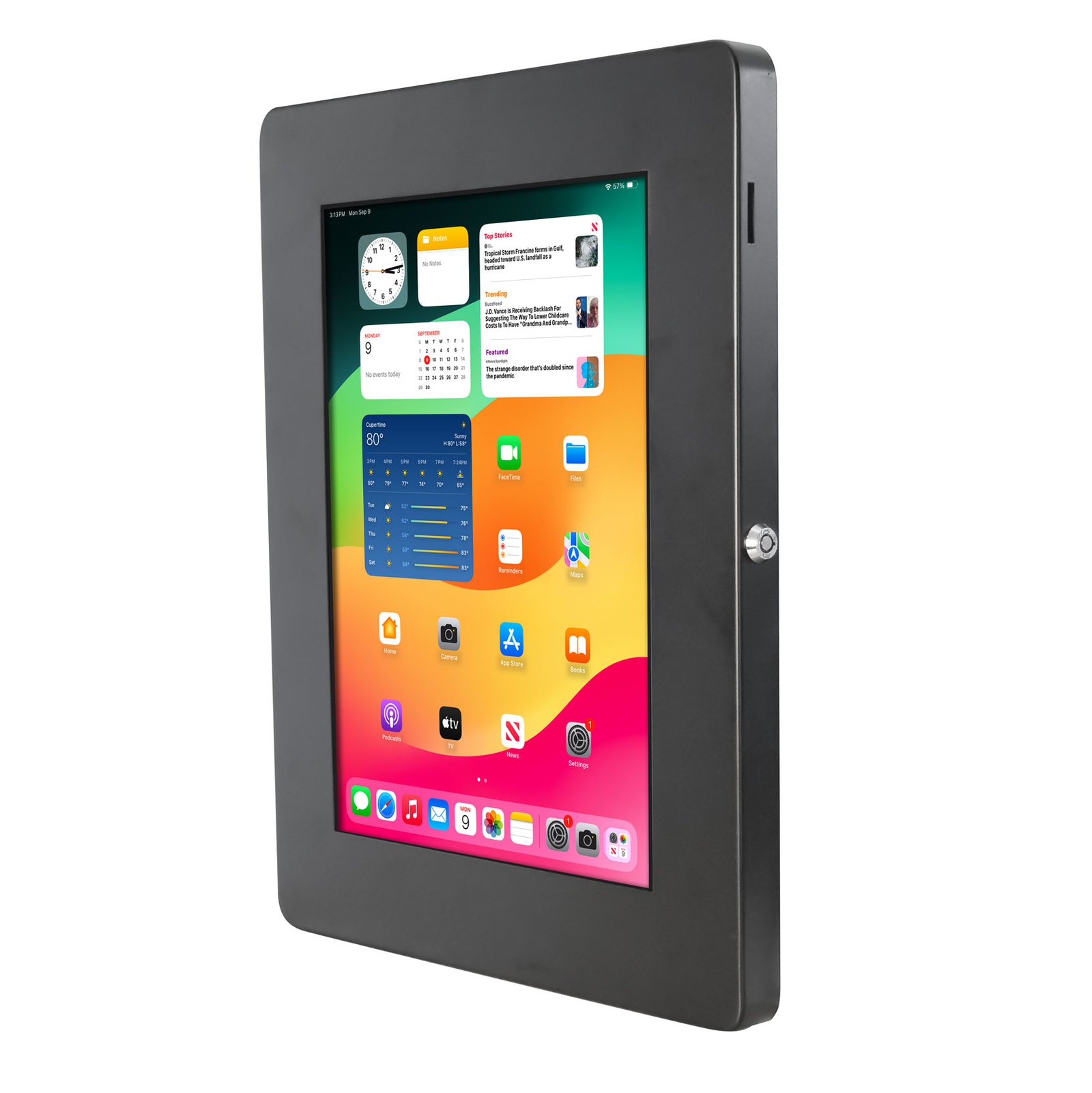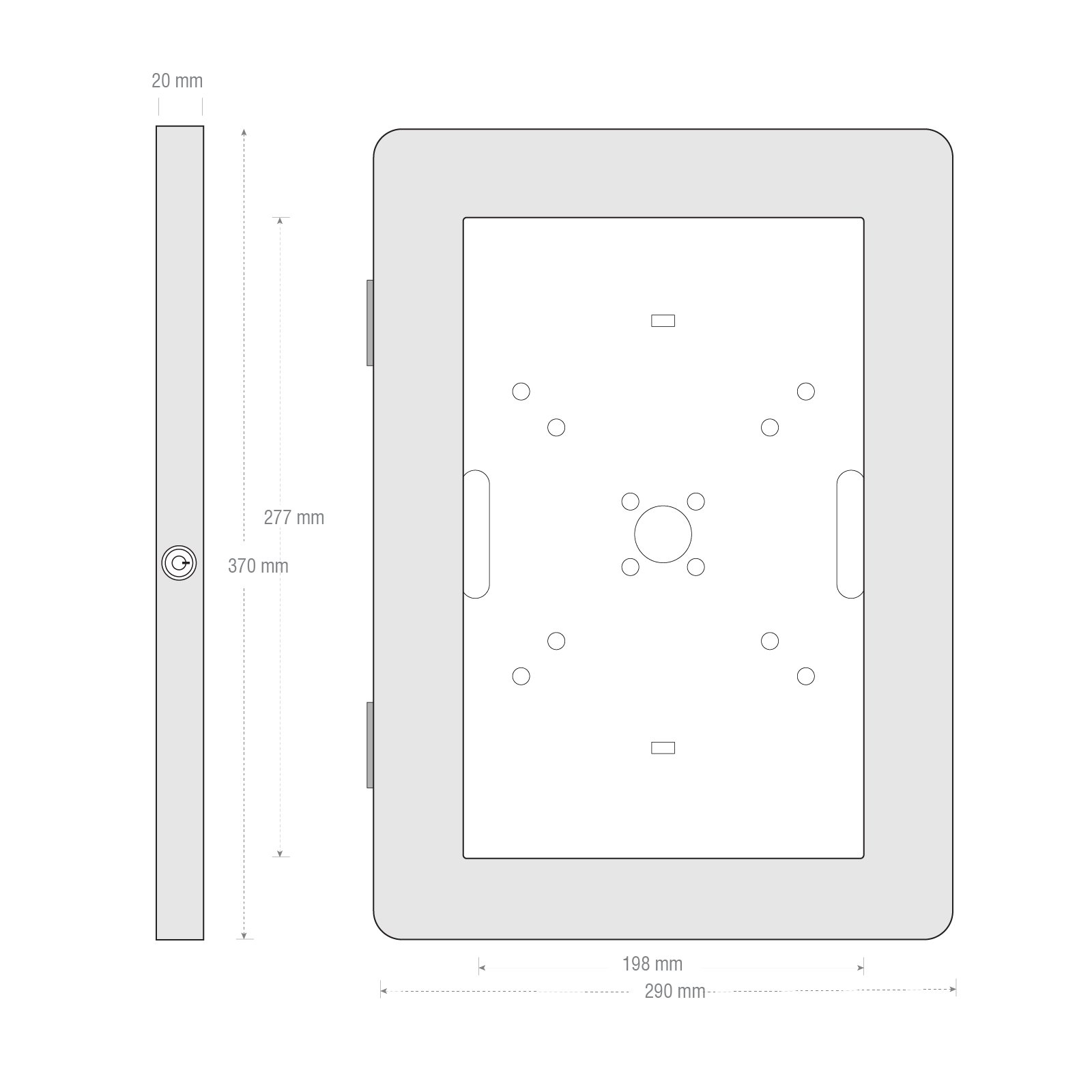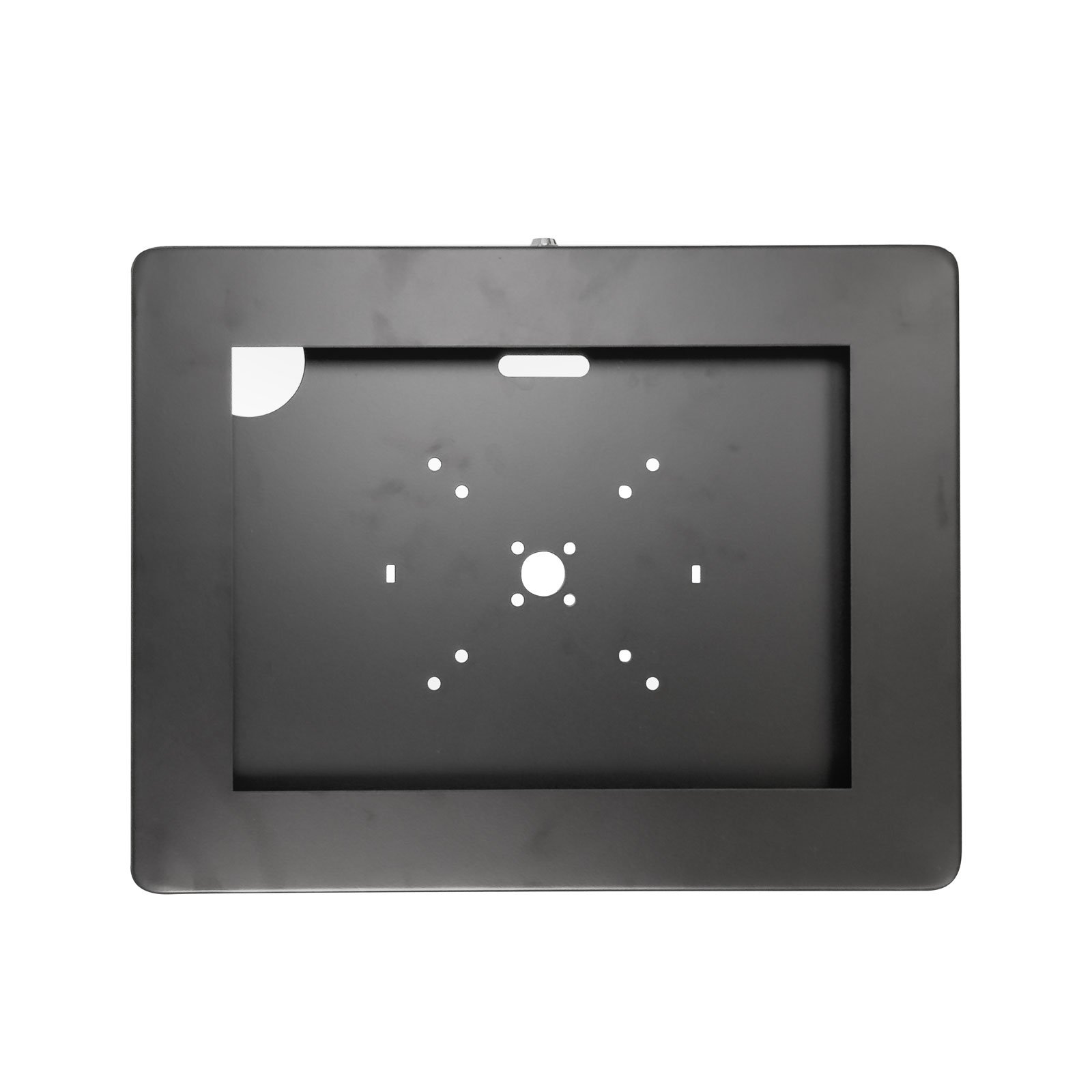 Este sistema se fija de forma directa a pared mediante tornillería oculta, ofreciendo un soporte robusto y seguro para el uso constante del dispositivo en espacios públicos o privados. Su marco metálico frontal incorpora una cerradura con llave para impedir manipulaciones no autorizadas, asegurando que la tablet permanezca protegida ante cualquier intento de extracción.