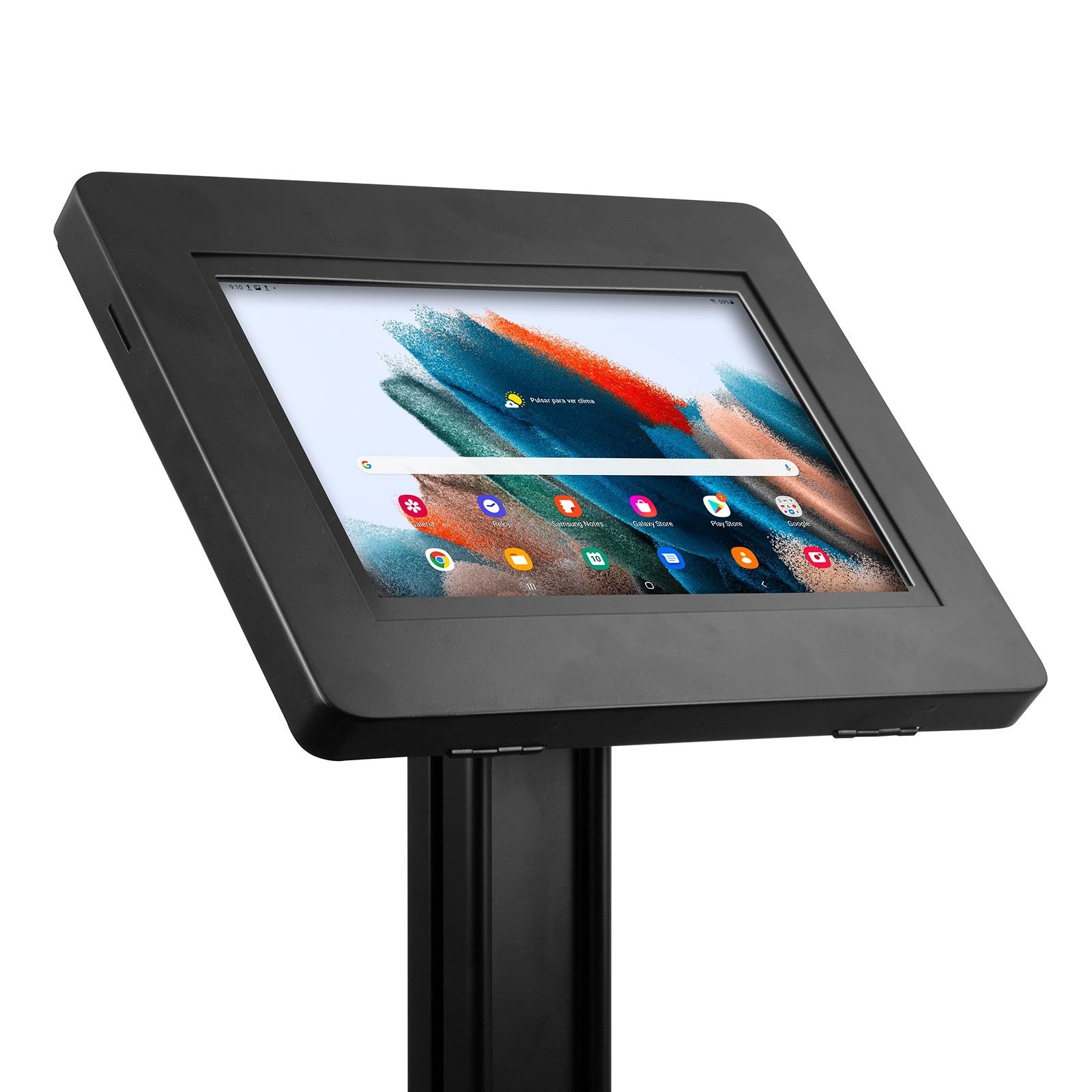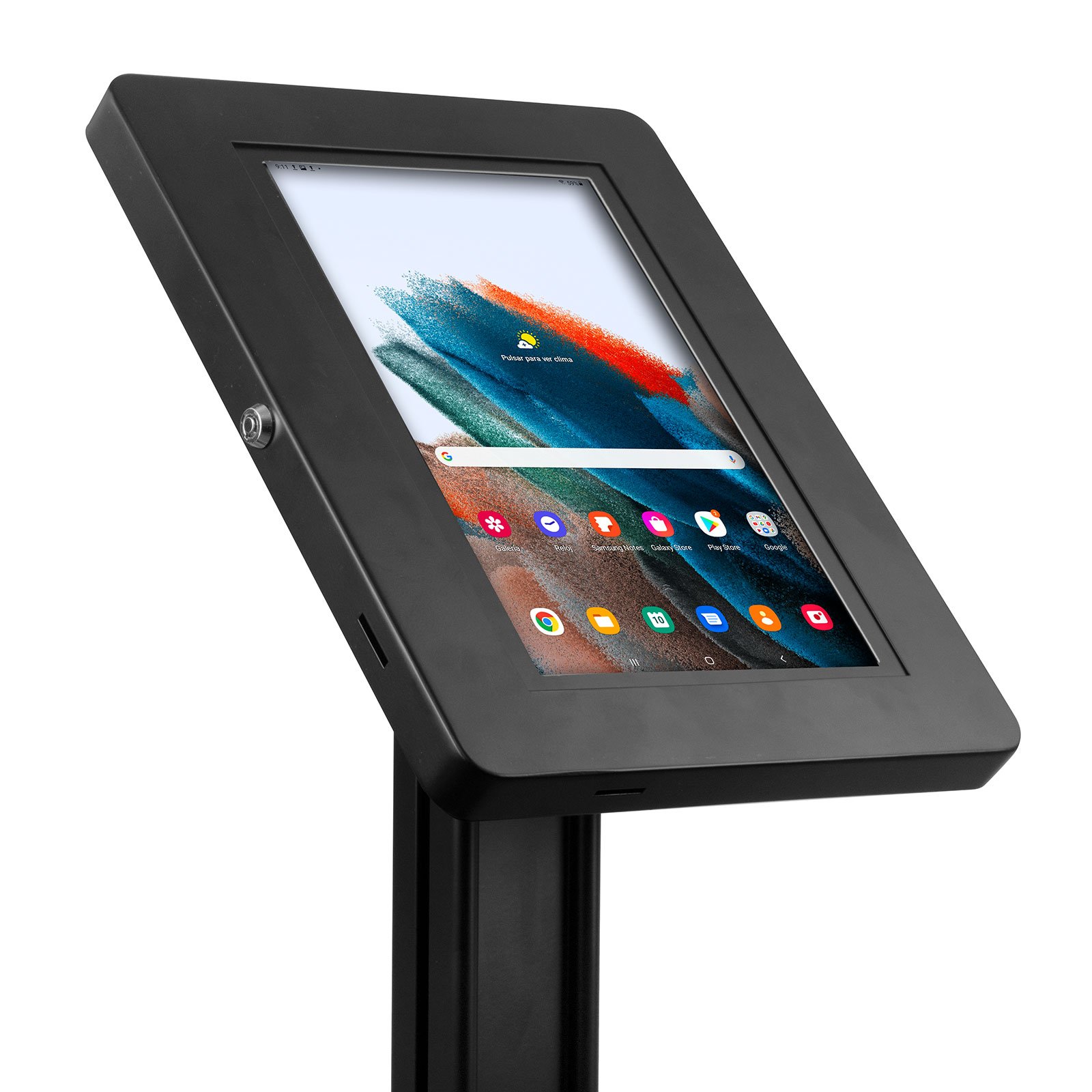 El pedestal SPN-K32BA8 es una solución de seguridad de piso diseñada para proteger tabletas Samsung Galaxy A7, A8 y otras de entre 9.7” y 11”. Fabricado en acero laminado de alta resistencia, este soporte antirrobo ofrece una fijación sólida al suelo, ideal para puntos de atención, exhibiciones interactivas o kioscos de autoservicio.