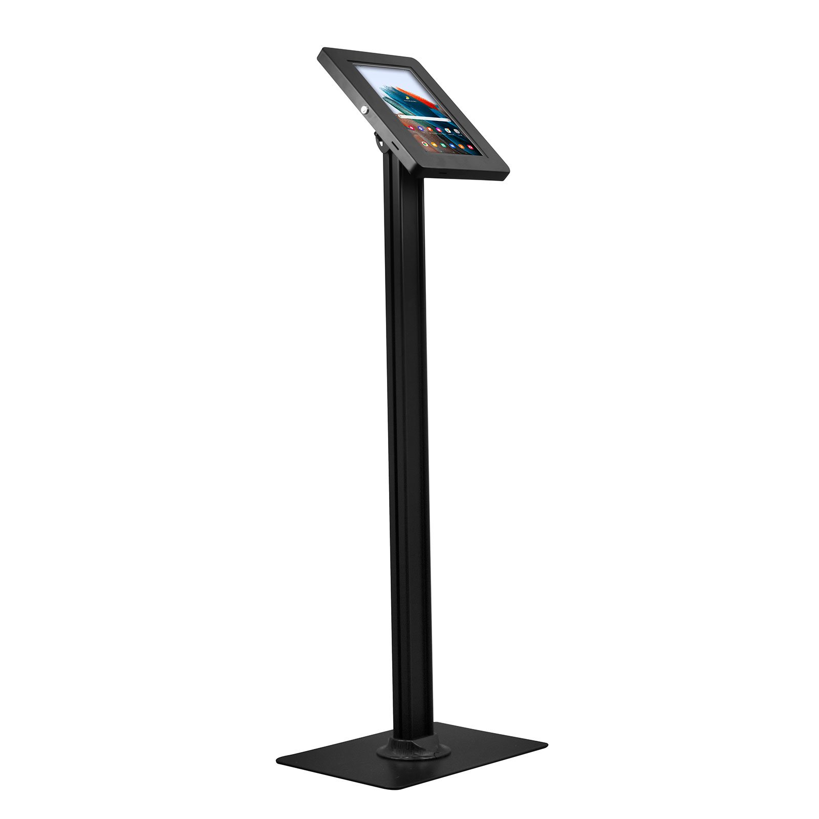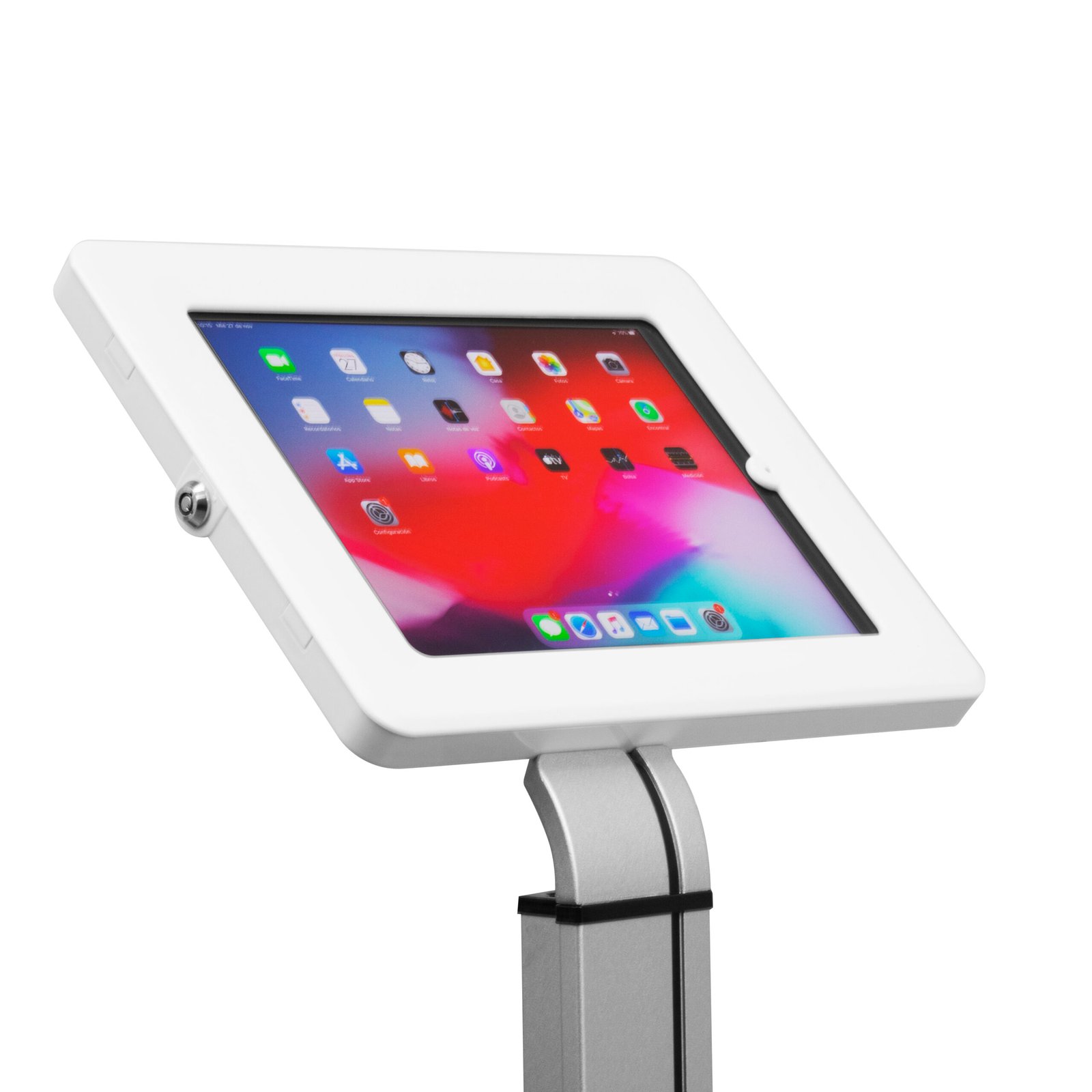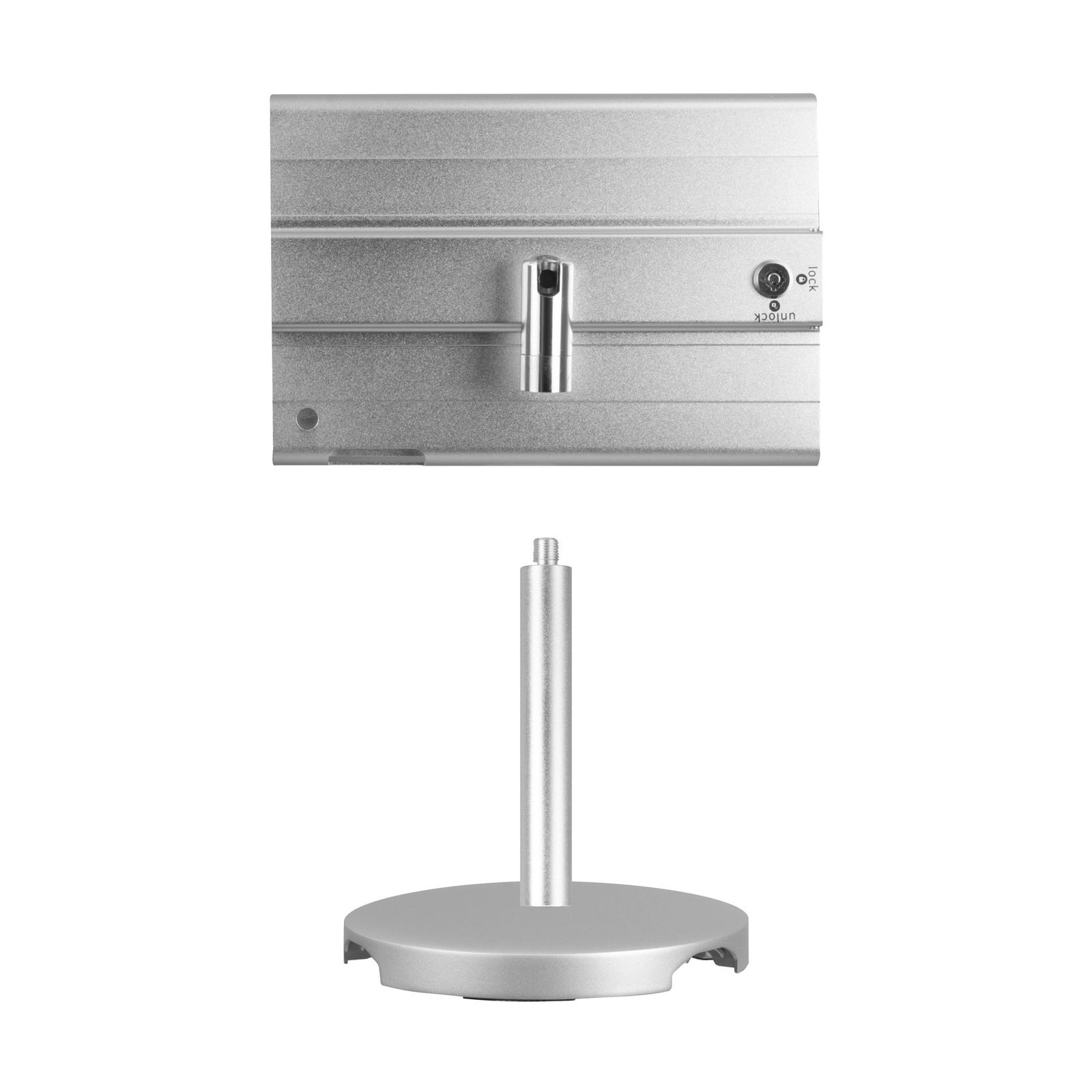 Con un diseño funcional y sobrio, el soporte permite la operación táctil del dispositivo desde el frente, ya que su ventana frontal está fabricada en material compatible con pantallas capacitivas. Ideal para integrarse en espacios corporativos, puntos de venta, clínicas, consultorios, museos o sistemas de check-in.