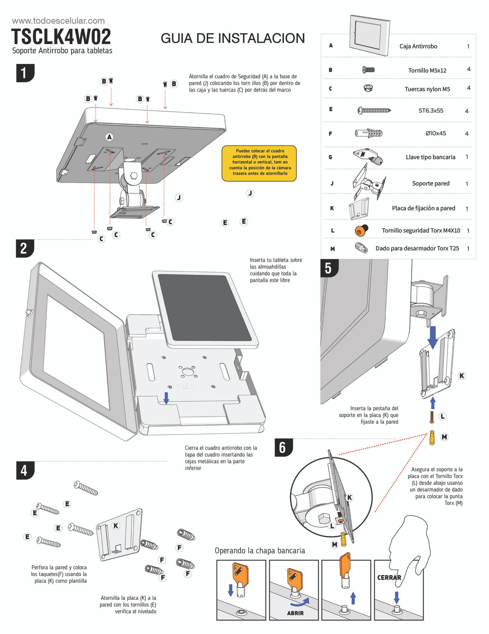 Está fabricado en lámina de acero de alta resistencia, con acabado texturizado horneado en color gris claro. Incluye cerradura metálica con llave para asegurar la tapa del marco y tornillos ocultos de fijación directa a muro. La instalación es rápida y estable.