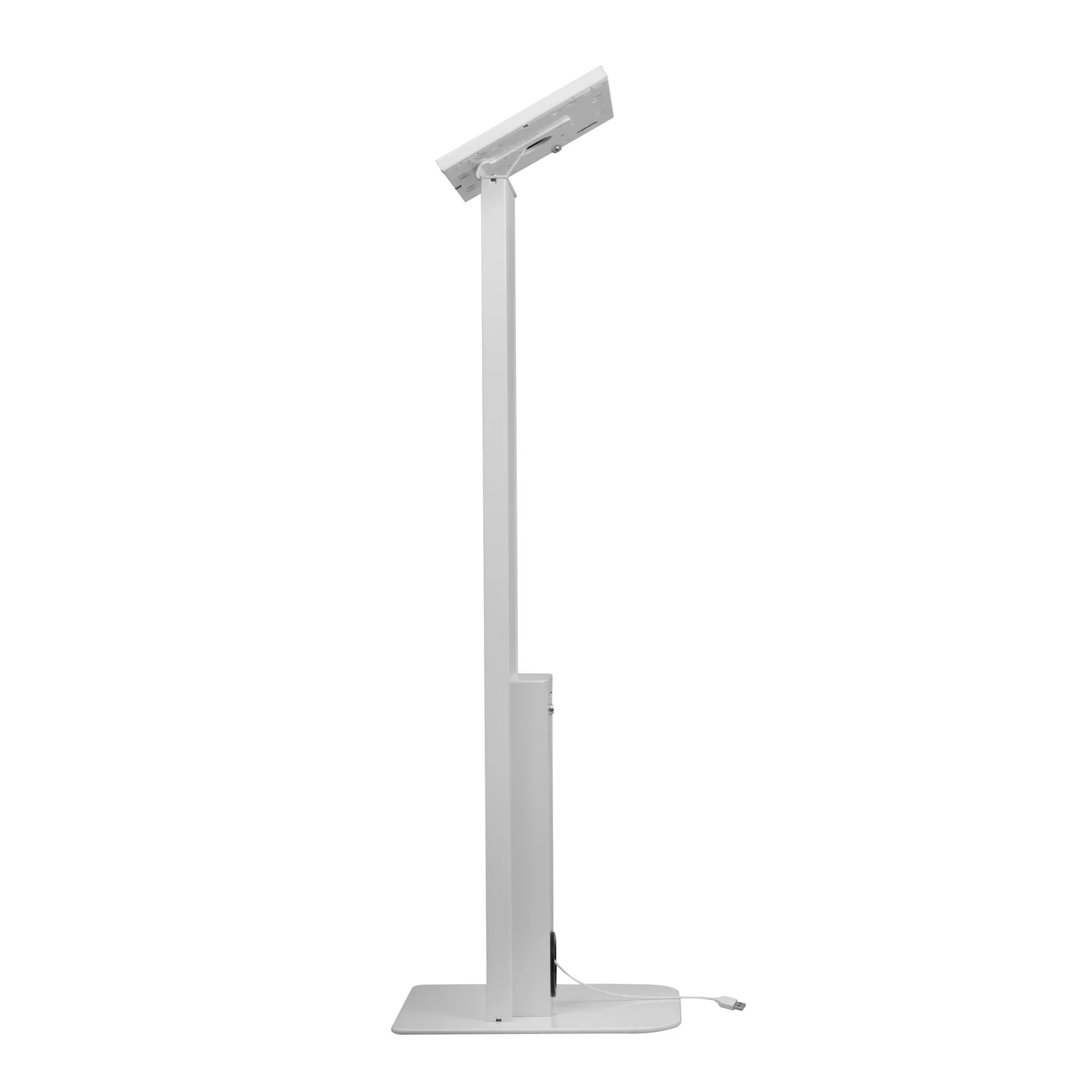 La base ancha proporciona estabilidad, mientras que el poste vertical eleva la tableta a una altura ergonómica perfecta para usuarios de pie. La caja metálica incluye cerradura frontal tipo bancaria, permitiendo proteger el equipo sin obstaculizar el uso de pantalla táctil, cámara ni botones.