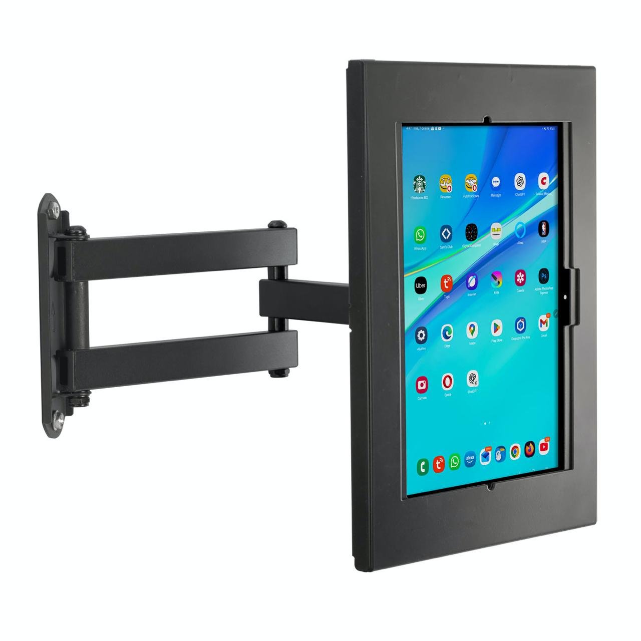 Brazo articulado con caja antirrobo metálica para tabletas Samsung Galaxy de 11 pulgadas con instalación segura y rotación completa.