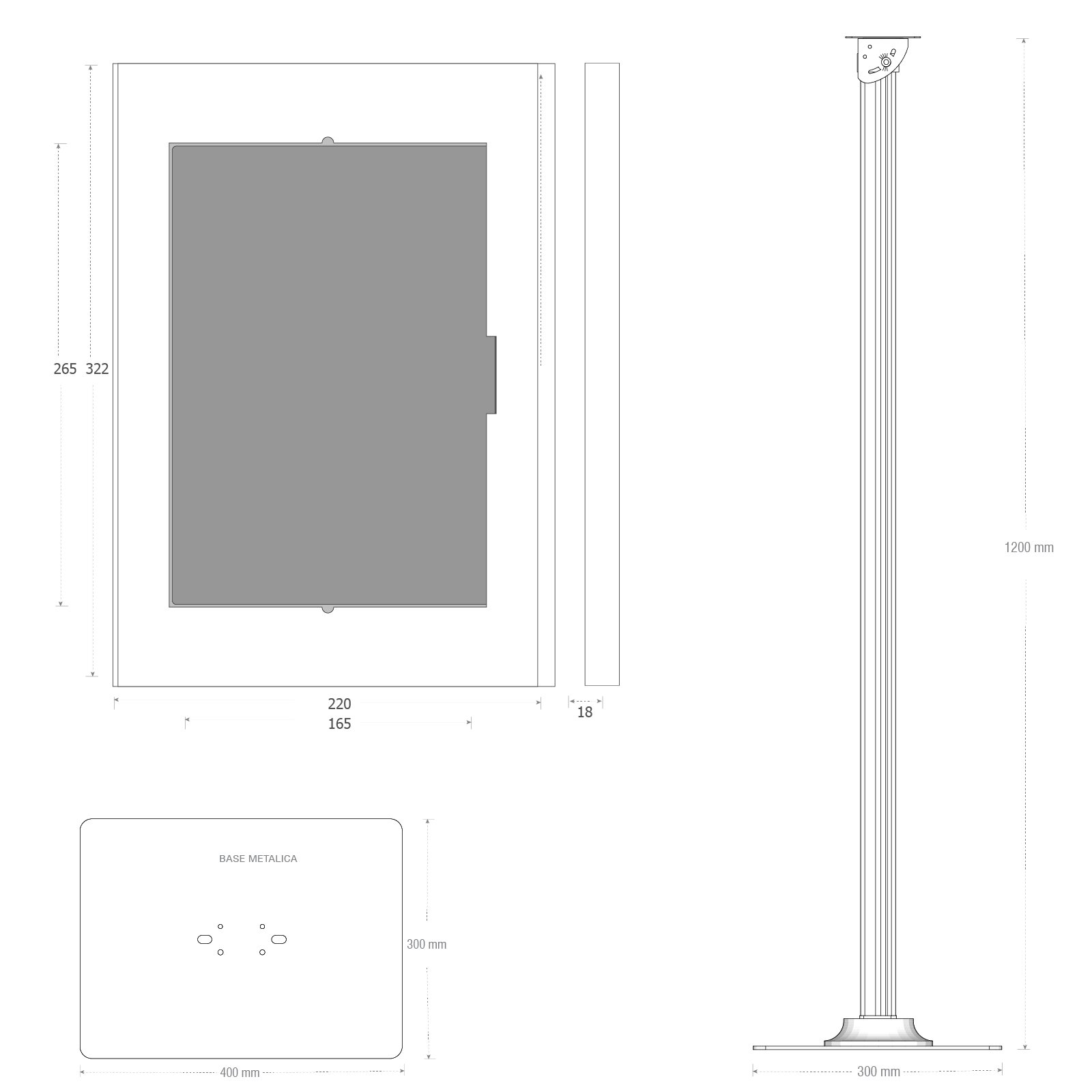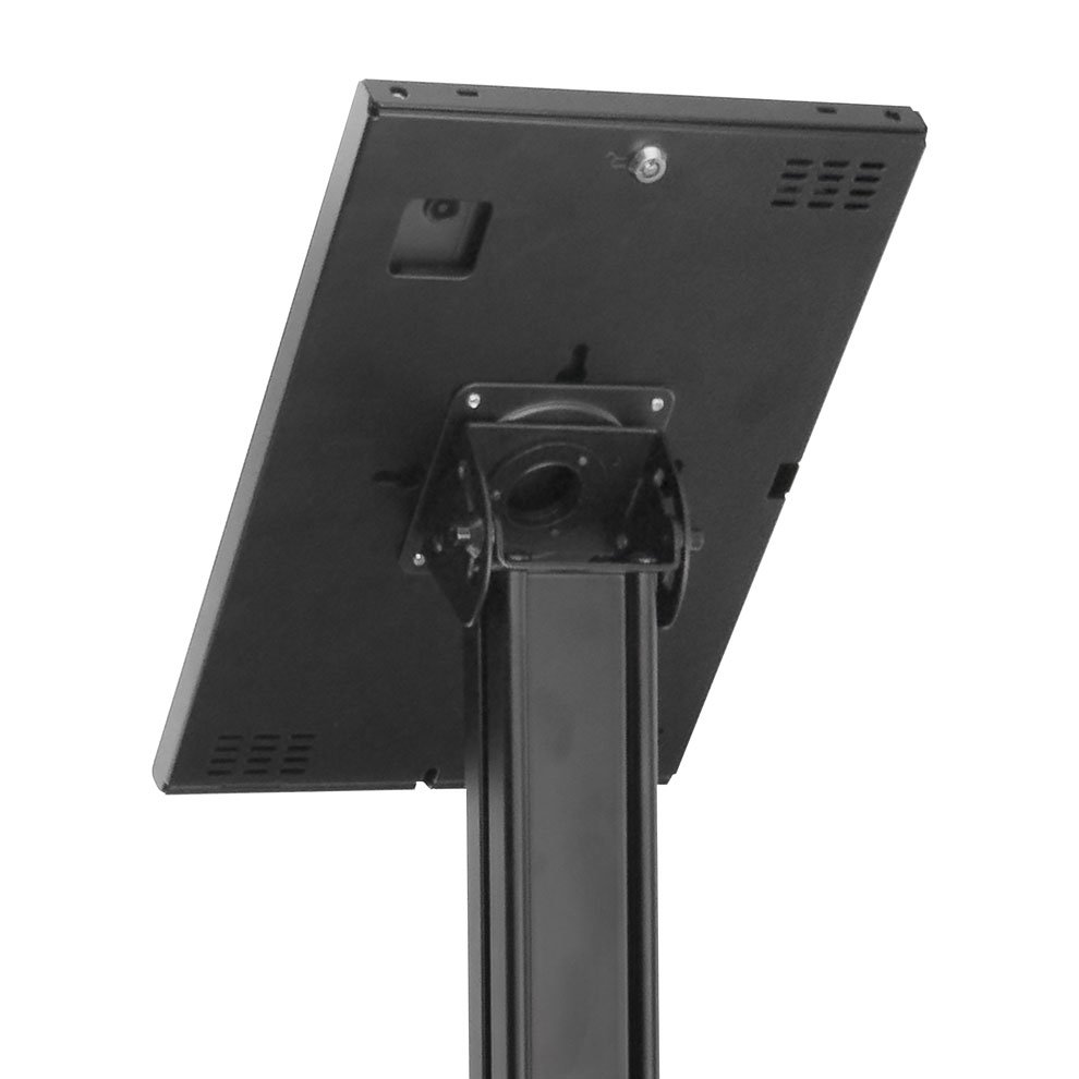 El pedestal LK32 está fabricado en acero y cuenta con una base atornillable al piso que proporciona firmeza y rigidez incluso en zonas de alto tránsito. Su perfil metálico permite el manejo interno del cableado, manteniendo una instalación ordenada y segura. La pantalla puede rotar libremente en 360 grados con bloqueo a 90 grados, mientras que la cabeza de inclinación graduable permite ajustes de hasta +75 grados, optimizando la visibilidad y la interacción del usuario. El poste metálico tiene una altura de 1100 mm, ideal para kioscos de autoservicio, puntos de información, control de accesos y exhibiciones digitales.