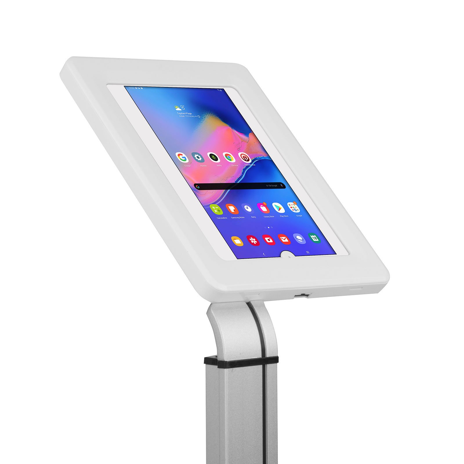El modelo SPNLK38A es un soporte de seguridad tipo atril para piso, diseñado específicamente para proteger y exhibir tabletas de 10.1″ con formato de pantalla 16:10, como Samsung Galaxy TAB A (2019) y Huawei Media PAD T5. Fabricado con poste de aluminio y caja de plástico ABS de alta resistencia, garantiza una protección firme y segura en entornos de alto tránsito como auditorios, recepciones de hoteles, restaurantes y centros de convenciones.