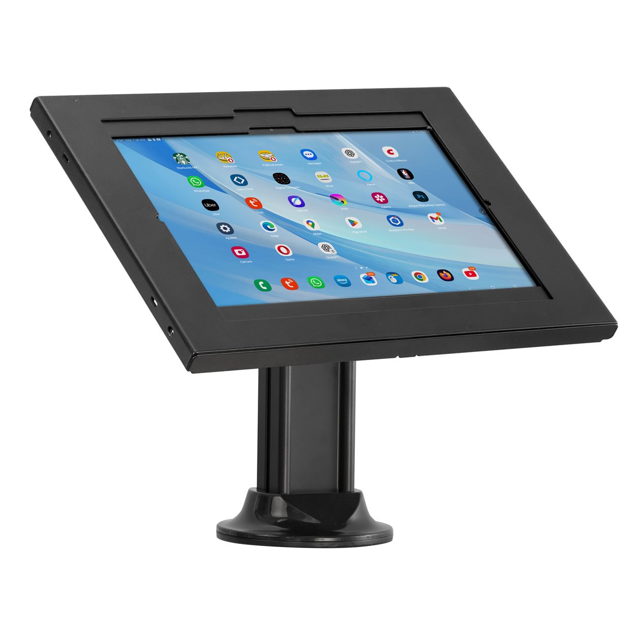 El SPNLK7W07M es un sistema profesional de soporte y protección diseñado para tabletas Samsung Galaxy de gran formato, ideal para puntos de venta, kioscos interactivos, estaciones de autoservicio, mostradores comerciales y entornos corporativos que requieren seguridad y estabilidad.