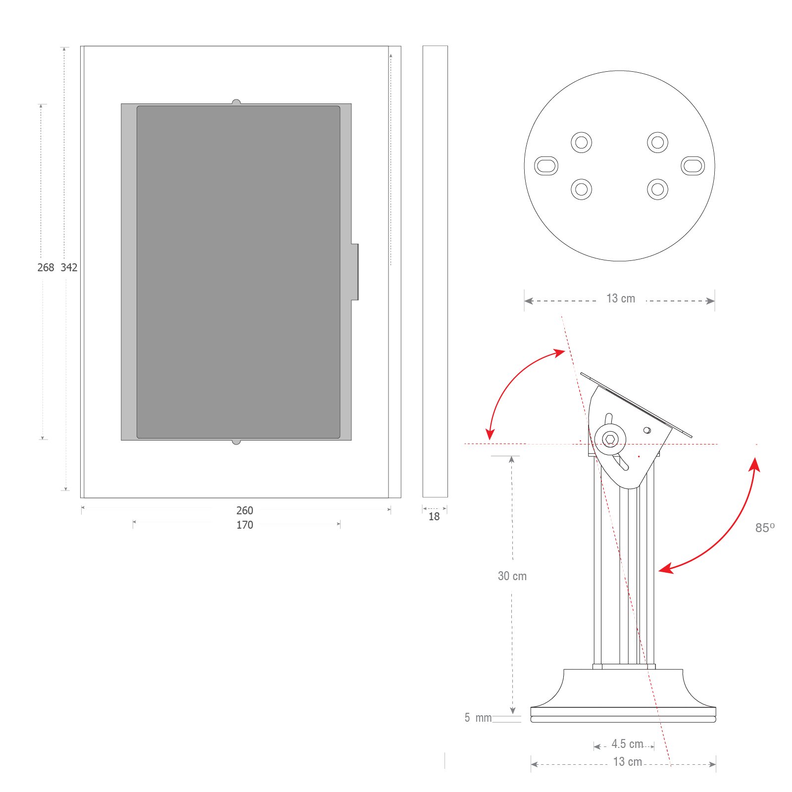 El pedestal LK32 está fabricado en acero y cuenta con una base atornillable al piso que proporciona firmeza y rigidez incluso en zonas de alto tránsito. Su perfil metálico permite el manejo interno del cableado, manteniendo una instalación ordenada y segura. La pantalla puede rotar libremente en 360 grados con bloqueo a 90 grados, mientras que la cabeza de inclinación graduable permite ajustes de hasta +75 grados, optimizando la visibilidad y la interacción del usuario. El poste metálico tiene una altura de 1100 mm, ideal para kioscos de autoservicio, puntos de información, control de accesos y exhibiciones digitales.